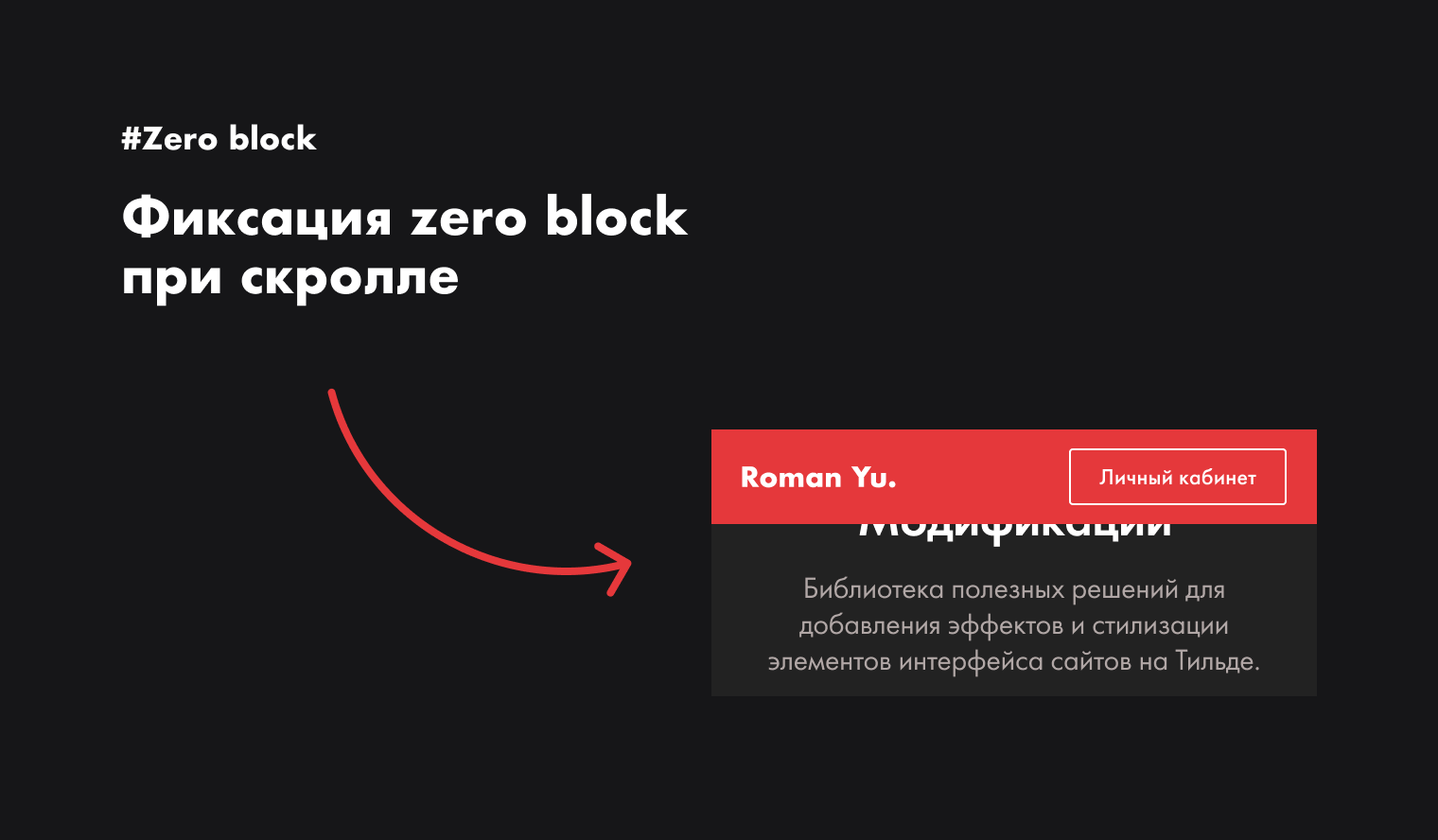 Модификация добавляет функционал конкретному Zero Block, который нужно зафиксировать при скролле сверху или снизу. В Тильде часто используют эту модификацию для фиксации меню или кнопок на Zero Block. Но можешь отрисовать другие элементы сайта в Zero block и зафиксировать их при скролле.